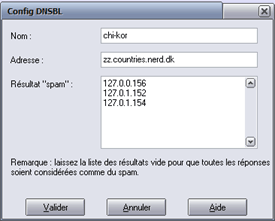 - Résultat "spam" : donne la liste des réponses possible du serveur, qui indique que l'adresse demandée est un spam. Une liste vide indique que toutes les réponses indiques un spam. Les valeurs à mettre dans cette liste dépendent de la configuration du serveur.
