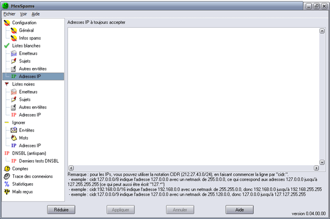 L'écran Listes blanches\Adresses IP permet de définir des adresses IPs dont vous voulez toujours accepter les messages.