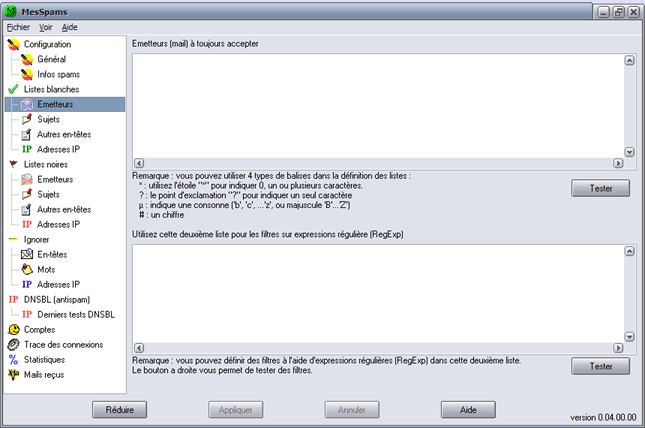 L'écran Listes blanches\Emetteurs permet de définir la liste des personnes (mails) dont vous voulez toujours accepter les messages