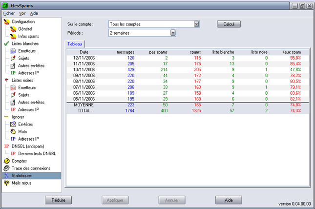 Cet écran affiche des statistiques sur la gestion de MesSpams.