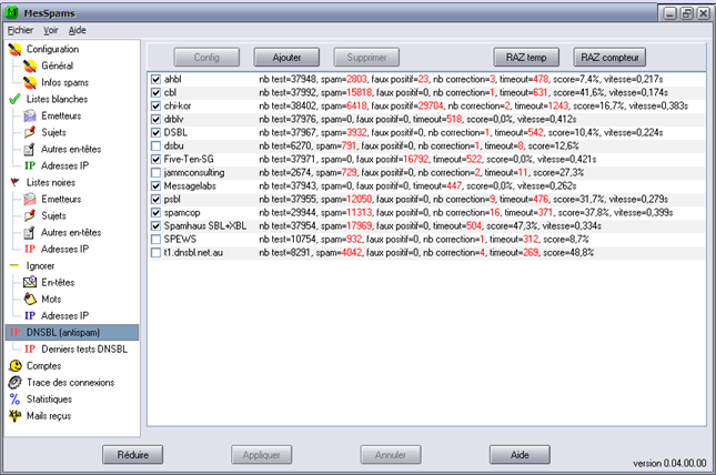 Les boutons sur le haut de l'écran permettent de modifier les DNSBL :